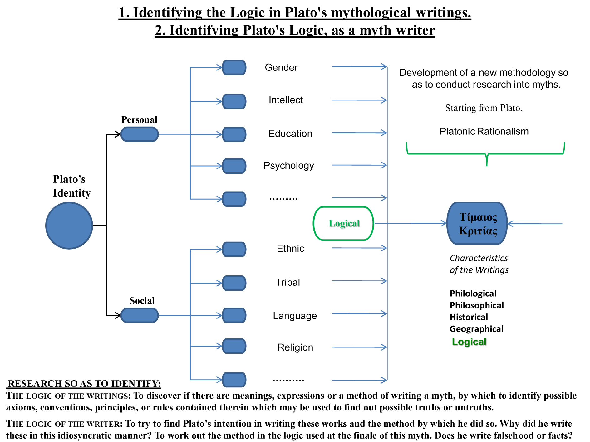 Διάγραμμα 1. Ήταν απαραίτητο να εντοπιστεί ο λόγος για τον οποίο ο ορθολογιστής Πλάτων έγραψε τον μύθο της Ατλαντίδας. Μια ακριβής εξήγηση θα έριχνε φως στα μυστήρια των μυθολογικών αναφορών. Για τον λόγο αυτό, ήταν απαραίτητο να εξακριβωθεί η μοναδική λογική της διαδικασίας σκέψης του συγγραφέα καθώς και η ιδιαιτερότητα με την οποία γράφτηκαν τα έργα αυτά. Με άλλα λόγια, επιχειρώντας να προσδιορίσουμε τη λογική του συγγραφέα, ήταν απαραίτητο να εντοπίσουμε το σκεπτικό του για τη συγγραφή του Τίμαιου και της Κριτίας. Οι όποιες μεθοδολογίες για τον σκοπό αυτό δεν έπρεπε να αφήνουν περιθώρια για παρανοήσεις ή αβεβαιότητες. Για τον λόγο αυτό, τα έργα υποβλήθηκαν σε ανάλυση μέσω της εφαρμογής μεθοδολογιών που ήταν αξιόπιστες για την ορθολογική τους προσέγγιση.