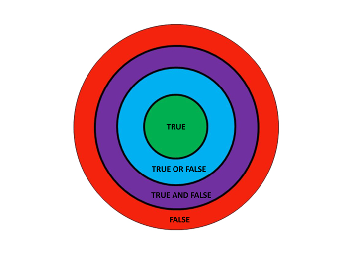 4) Finally, the blue zone represents the category of questionable truth or the category of concepts that may be either TRUE OR FALSE. For example, is the story of Atlantis a true story or is it a figment of the imagination?