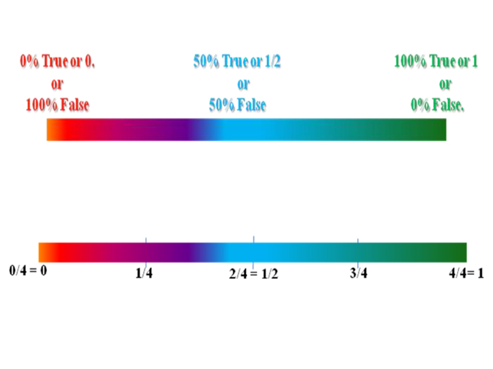 Figure 4 (upper). Sometimes given, is information (or meaning) which is equally disputable as to whether it is True or False. This is characterised as a 50% case of True or False. ( ½ true or ½ false). Figure 5 (Bottom). Sometimes, there is given information (or meaning), the truth of which is not perceivable and confirmation is required by the discerning reader to accept it as such. Because the item of information is closer to being factual, this situation is regarded as 75% True or, in other words, ¾ Truth (probably true or ¼ false).