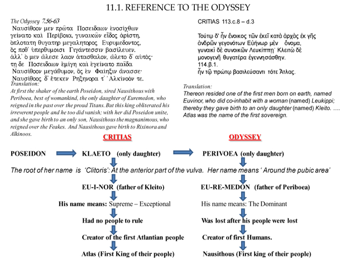 Figure 13. It is manifest that Plato ‘points’ his reader to Homer’s Odyssey. Poseidon united with Klaeto in Critias and with Perivoea in the Odyssey. Both female names are characteristic of the female physique. Also the fathers of these women had very similar circumstances and finally, Atlas and Nausithous were the first Kings of their respective people. It is obvious that Plato ‘relates’ the myth of Atlantis to that of the Odyssey. Plato ‘signals’ his reader to be alerted, instigating him to find out why.