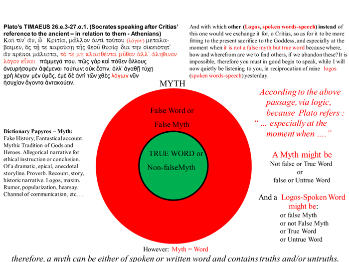 It is generally accepted that in order to correctly identify and convey the Logic of writings, it is necessary to make a connotatively accurate rendition of the words, sentences, passages, units, in short, of the literary output as a whole. So too with Plato’s two books, Timaeus and Critias. The initial challenge of defining the true meanings had already been met and overcome via an exhaustive enquiry as to what Plato indeed wished to convey through these two books of his. So there remained to conduct an in-depth and in breadth analysis by applying the MoM to the texts so as to locate the Logic articulated therein and by this means identify, to the extent possible, what the structure, function, audience etc of a myth might be.
